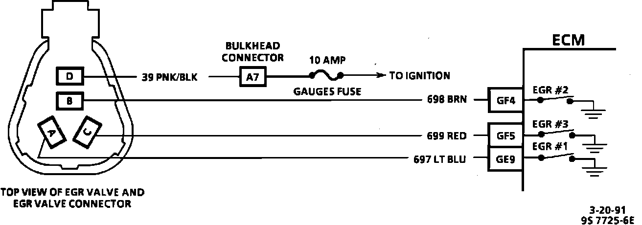 The digital EGR valve is designed to accurately supply exhaust gas to the engine without the use of manifold vacuum. The valve controls EGR flow from the exhaust to the intake manifold through three orifices, which increment in size to produce seven combinations. When the solenoid is energized, the armature, combined with an attached shaft and swivel pintle, is raised and the orifice is opened.