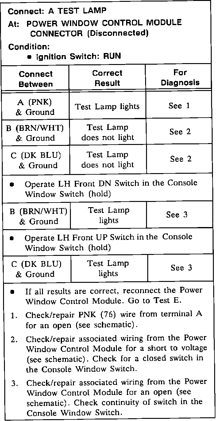 Test C: Power Window Control Module Test: