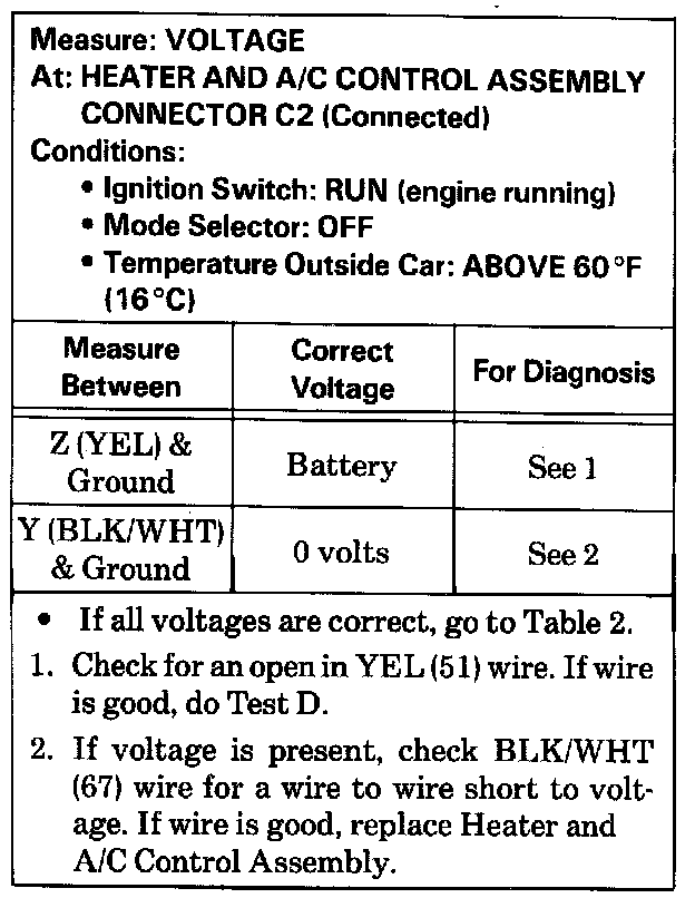 Test C: A/C Compressor Mode Control Test (Table 1):