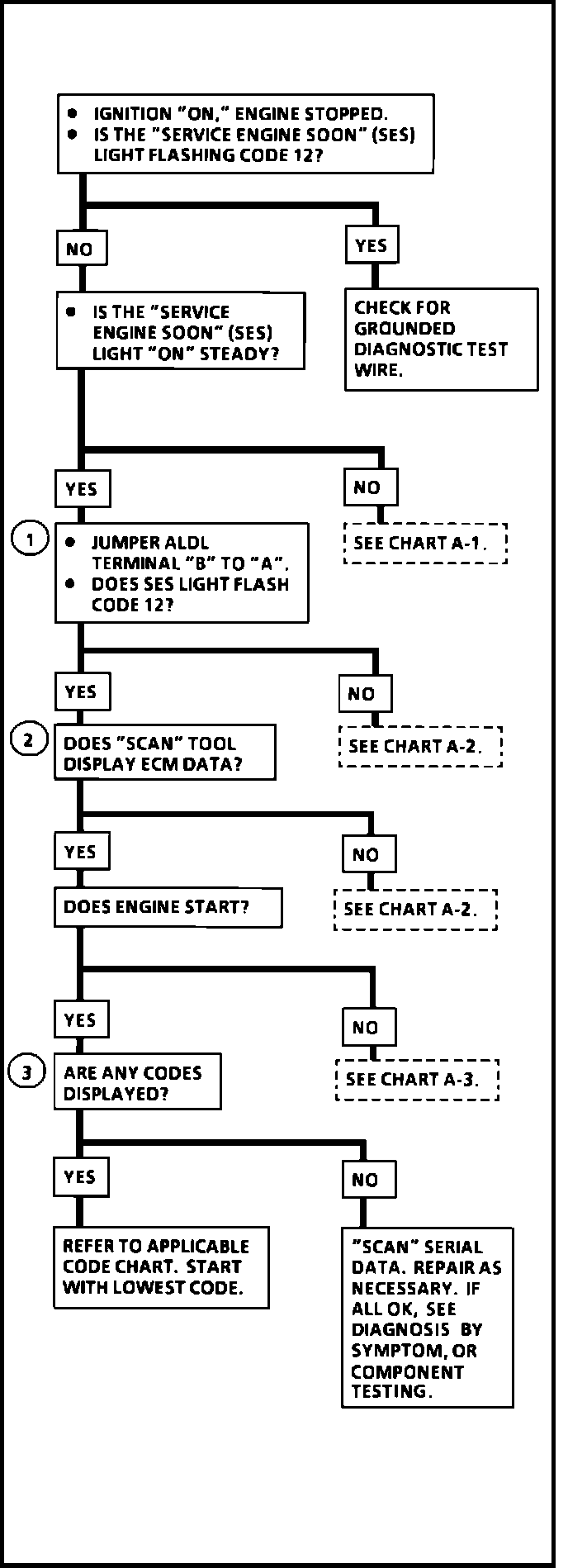 1. Bulb Check - to check "SES" light circuit and that the computer can complete the circuit. The system check starts with a bulb check. If there is no "SERVICE ENGINE SOON" light, refer to CHART A-1.