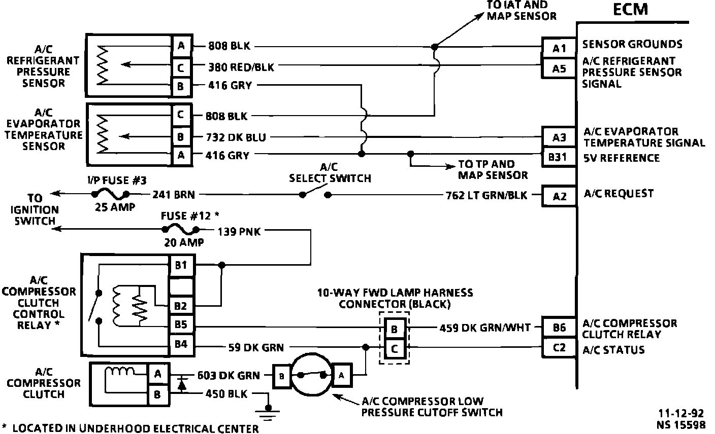 The ECM utilizes the A/C request signal to energize the A/C clutch relay, unless abnormal pressure is detected. The ECM also enables the cooling fan motors when A/C is requested.