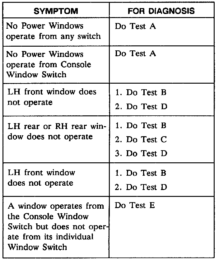 Power Windows Symptom Chart: