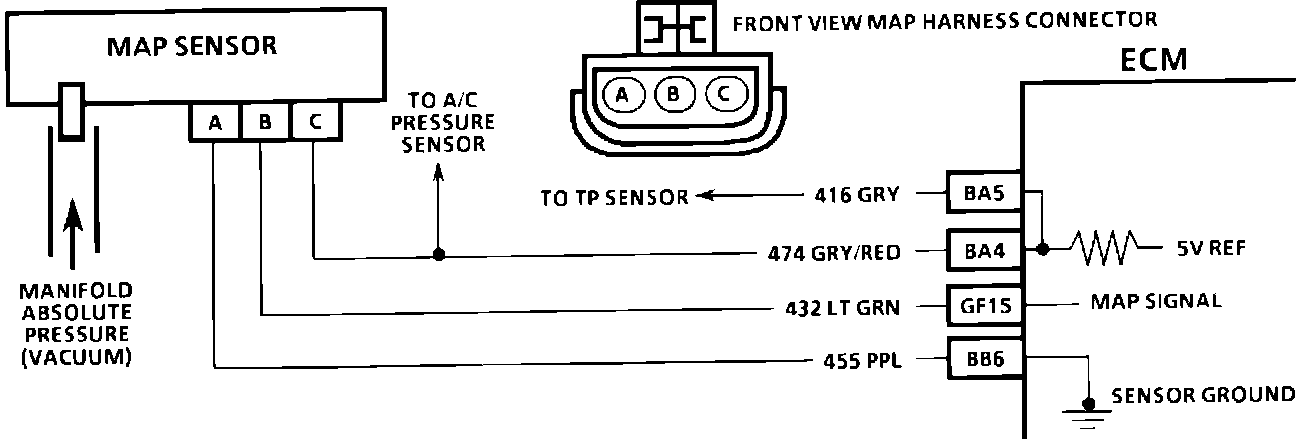 The Manifold Absolute Pressure (MAP) sensor measures the changes in the intake manifold pressure which result from engine load (intake manifold vacuum) and RPM changes; and converts these into a voltage output. The ECM sends a 5 volt reference voltage to the MAP sensor. As the manifold pressure changed, the output voltage of the sensor also changes. By monitoring the sensor output voltage, the ECM knows the manifold pressure. A lower pressure (low voltage) output voltage will be about 1-2 volts at idle. While higher pressure (high voltage) output voltage will be about 4-4.8 at Wide Open Throttle (WOT). The MAP sensor is also used, under certain conditions, to measure barometric pressure, allowing the ECM to make adjustments for different altitudes. The ECM used the MAP sensor to control fuel delivery and ignition timing.
