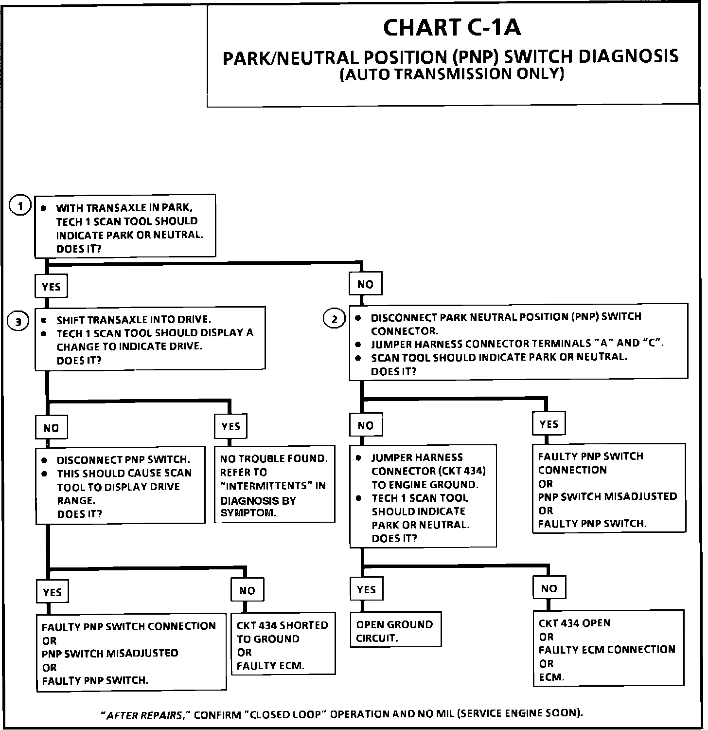 If CKT 434 indicates PNP (grounded), while in drive range, the EGR would be inoperative, resulting in possible detonation. If CKT 434 indicates drive (open) a drop in the idle may occur when the gear selector is moved into drive range.