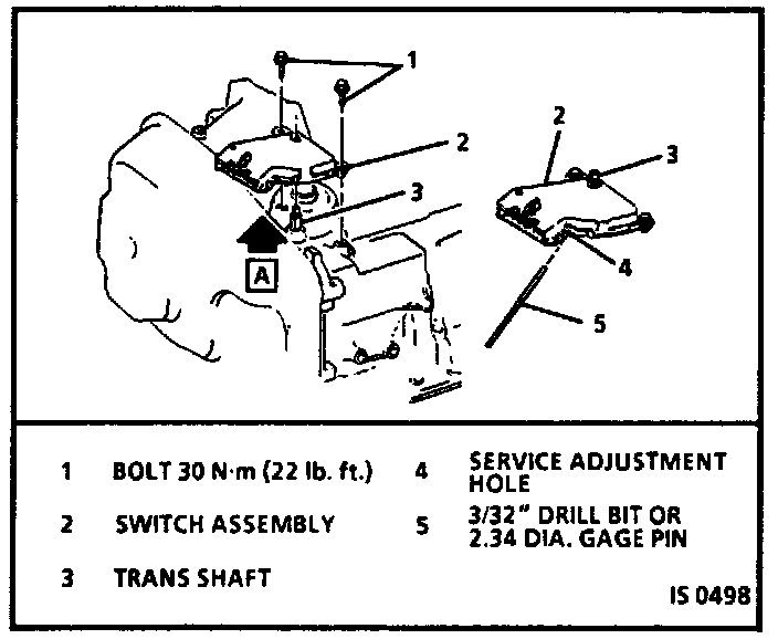 4. Insert gage pin in service adjustment hole and rotate switch until pin drops in to a depth of 9 mm (9/64").