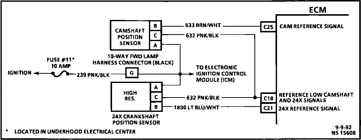 The camshaft position sensor is a "Hall effect" switch, located on the front top of the engine. It is supplied ignition voltage and has its own ground. The sensor sends a signal to the ECM when the #1 cylinder is on the intake stroke.