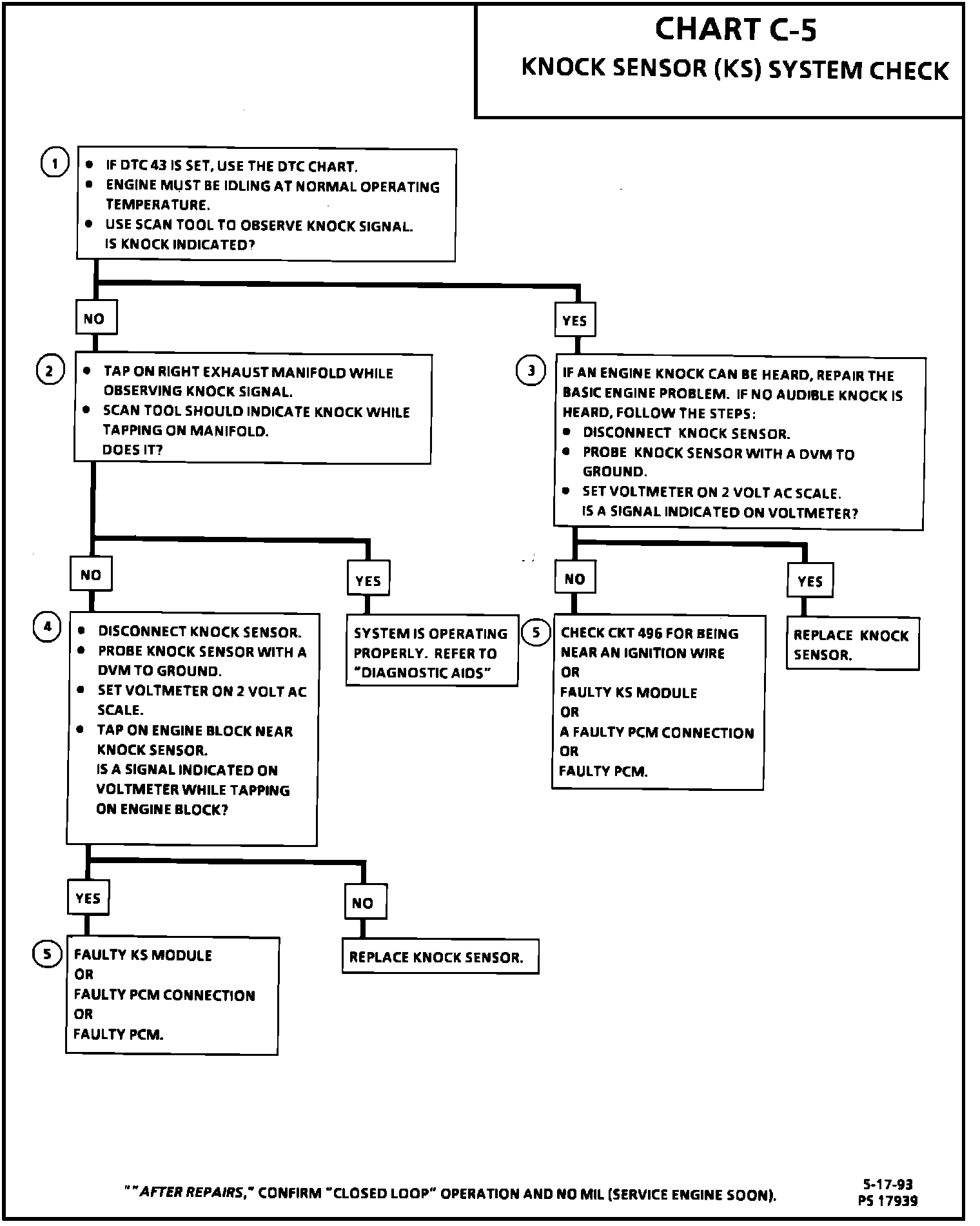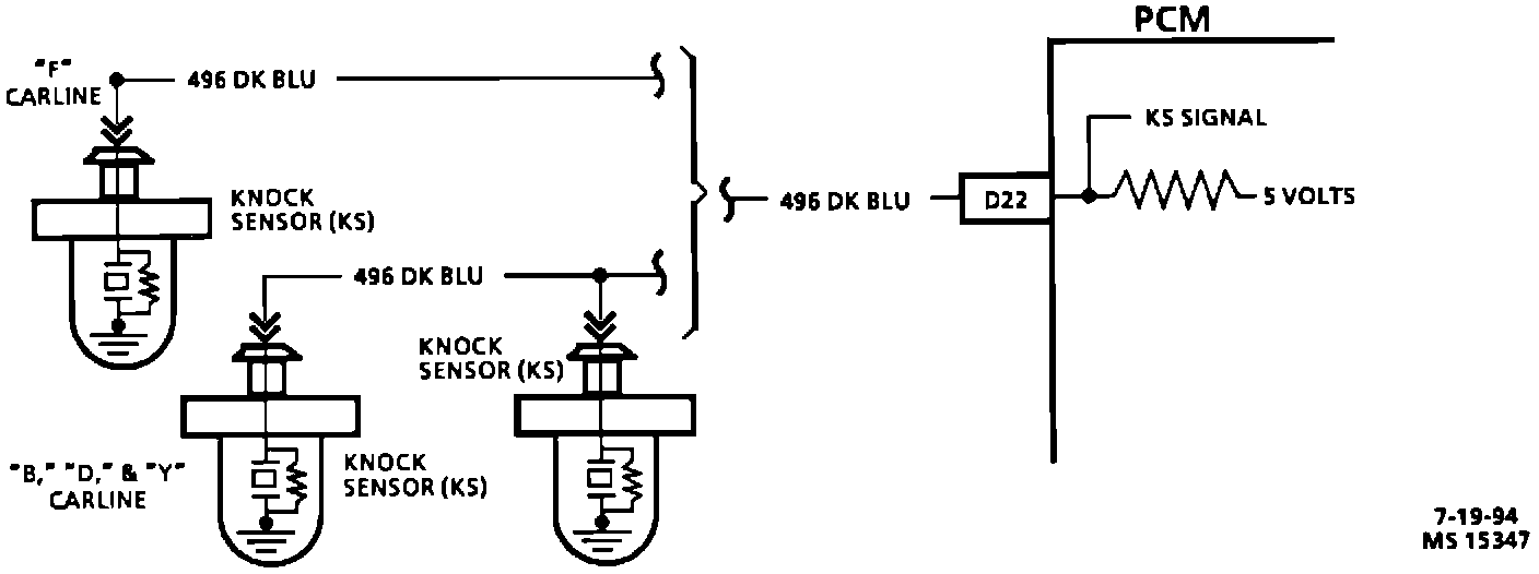 The knock sensor system is used to detect engine detonation. The PCM will retard the spark timing based on signals form the knock sensor module. The knock sensors produce an AC voltage which is sent to the KS module. The amount of AC voltage produced by the sensors is determined by the amount of knock. The circuitry within each knock sensor causes the PCM's 5 volts to be pulled down so that under a no knock condition, CKT 496 would measure about 2.5 volts.
