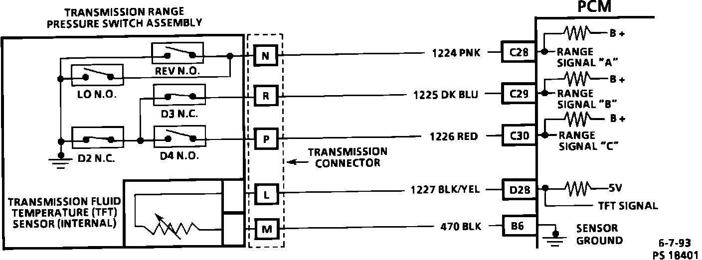 Five pressure switches, two normally closed and three normally open, detect fluid pressure within the valve body passages. The combination of pressure switch state determines voltage signal, B+ or 0, on each range signal to the PCM.