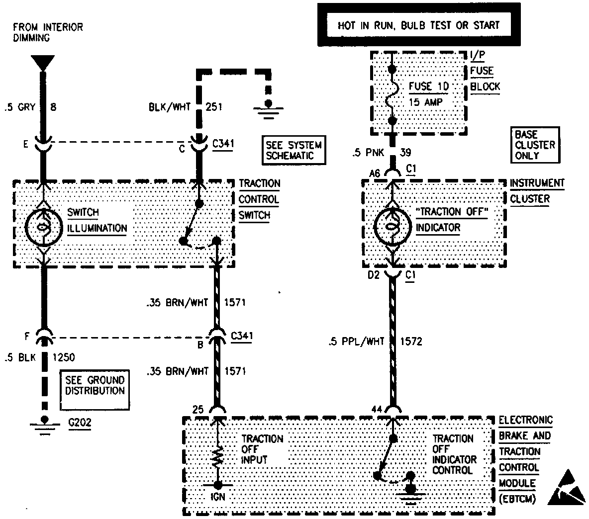 The traction control switch illumination bulb is on whenever the key is in the RUN, BULB TEST, or START position. It is not serviced separately from the traction control switch. The traction control switch illumination is not illuminated when there is an ABS or TCS system failure.