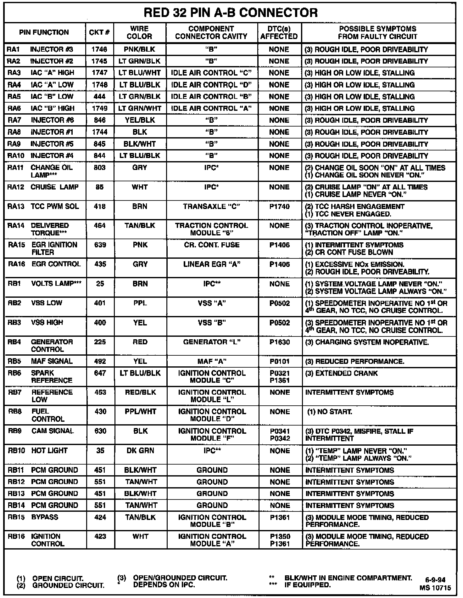 Powertrain Control Module (PCM) Connector Symptoms Chart: