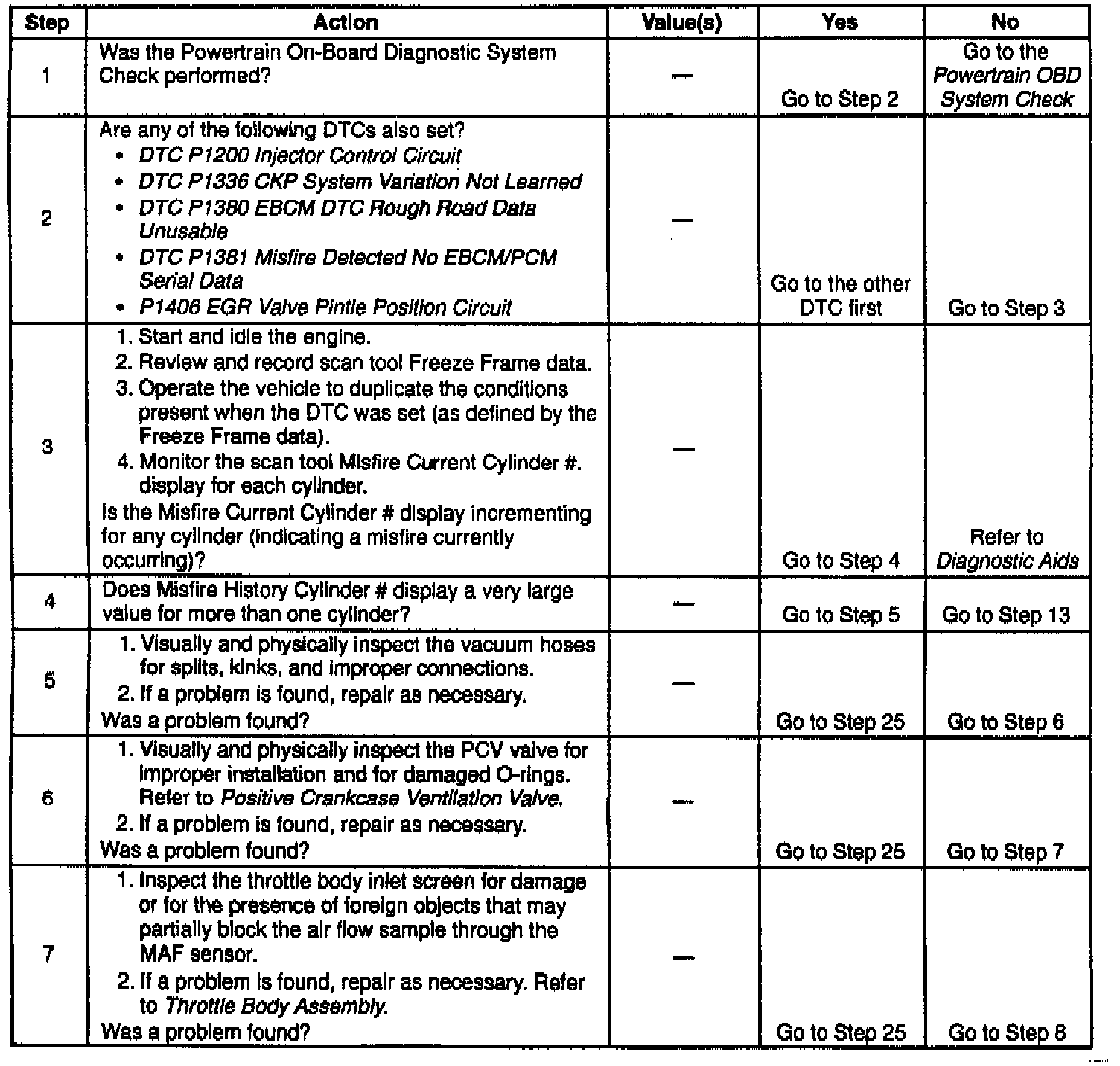This bulletin is being issued to revise the DTC PO3OO - Engine Misfire Detected diagnostic table in Engine Controls, Section 6E. The previous diagnostic table included a step instructing the technician to disconnect the MAF sensor while monitoring the misfire information on the scan tool. The misfire information on the scan tool will stop updating with the MAF sensor disconnected. The revised table removes steps instructing the technician to disconnect the MAF sensor.
