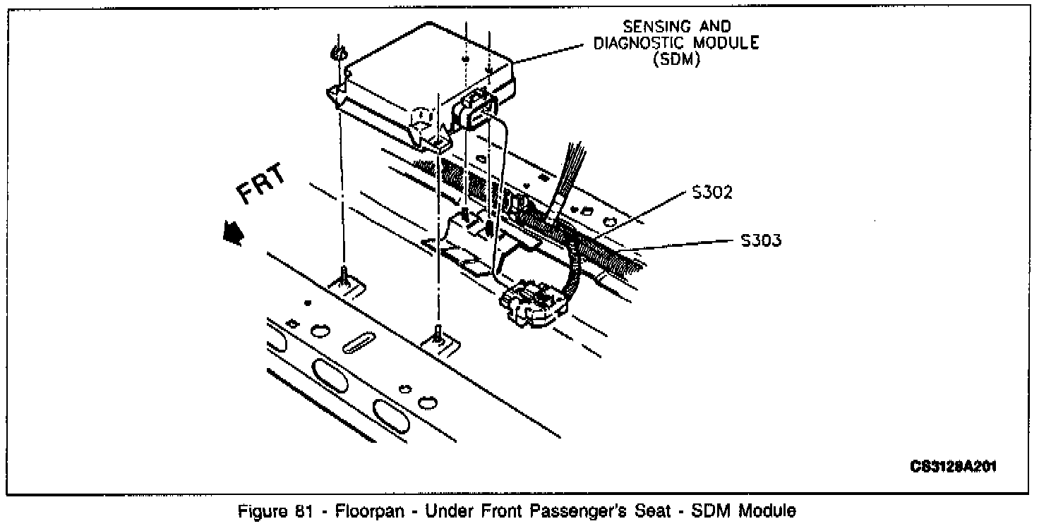 The illustration states the correct location of the SDM module, "Under Front Passenger's Seat".