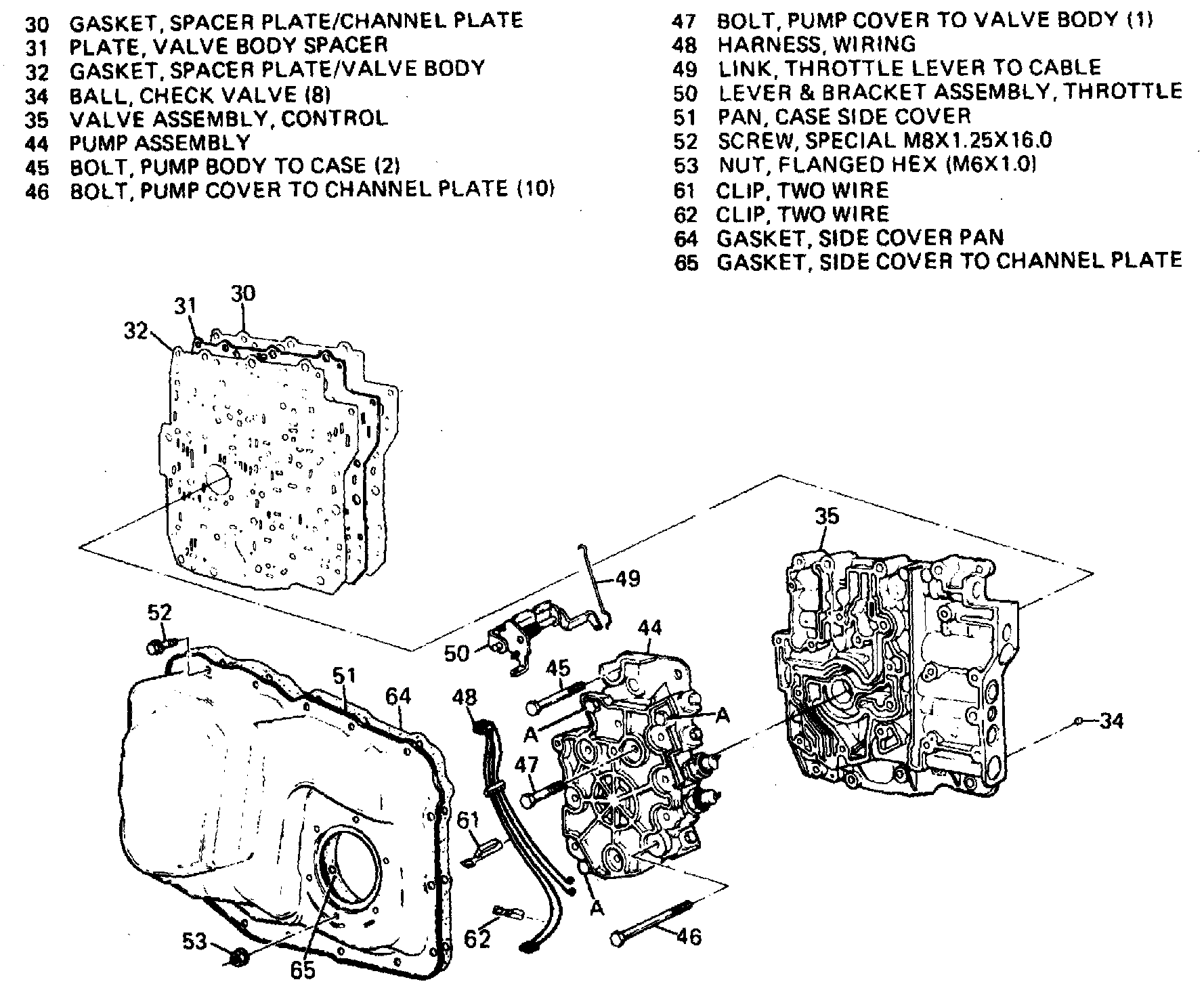 17. Remove valve body retaining bolts, valve body, oil pump and gaskets as an assembly. Do not remove three No. 40 Torx bolts securing oil pump together.