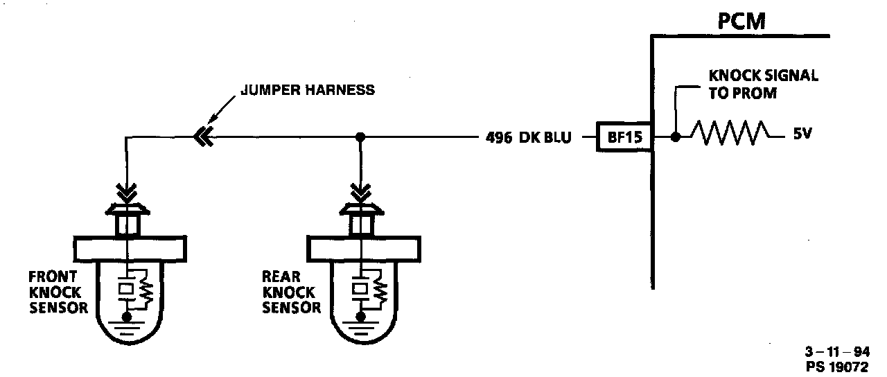 The Knock Sensors (KS) are used to detect engine detonation and allow the Powertrain Control Module (PCM) to retard the Ignition Control (IC) timing based on the signal being received. The circuitry within the knock sensors cause the PCM's supplied 5 volts signal to be pulled down, so that under a no knock condition CKT 496 would measure about 1.3 volts. The knock sensors produce an AC signal which rides on the 1.3 volts DC voltage. The signal amplitude and frequency is dependent upon the knock level.