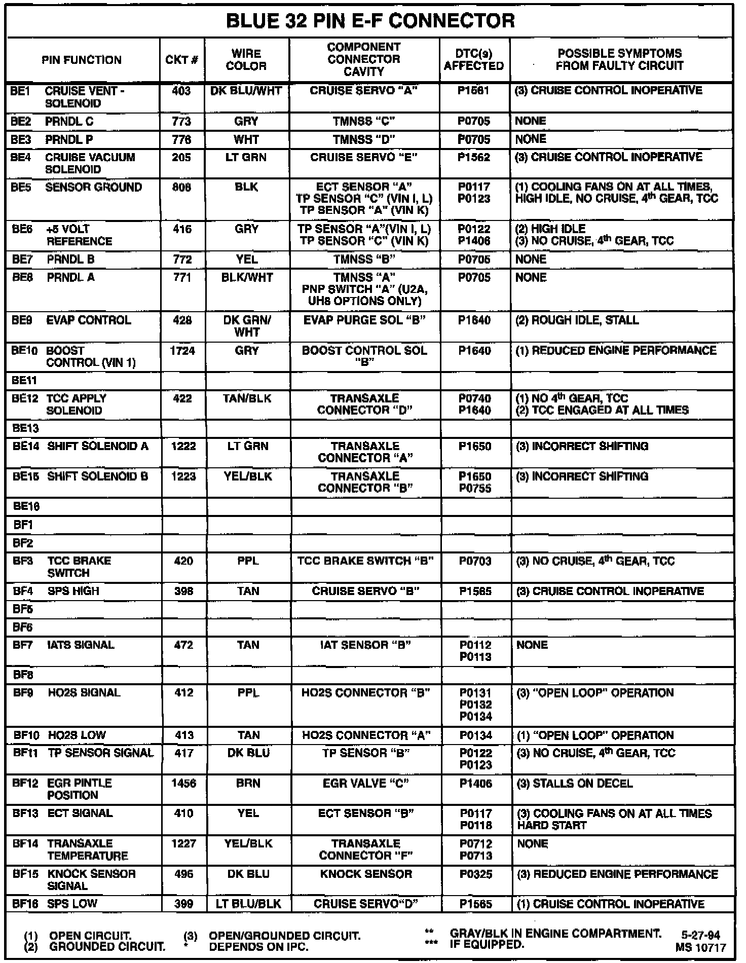 Powertrain Control Module (PCM) Connector Symptoms Chart: