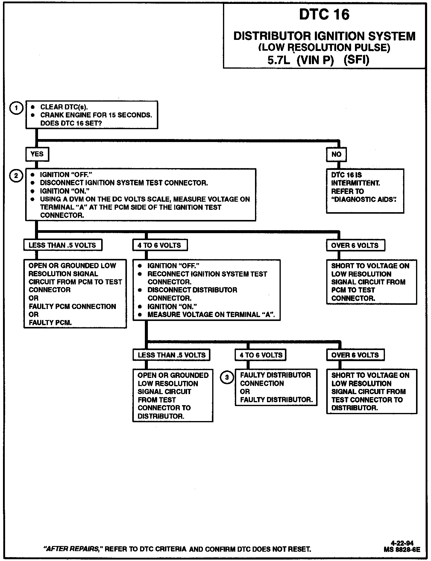 DTC 16 will set if the high and low resolution signal circuits are shorted to each other. Before replacing any components, make sure these circuits are not shorted together. If DTC 16 does not reset and the vehicle still does not start, refer to Diagnostic Charts/A Charts/Chart A-3. Related Tests, Information and Procedures