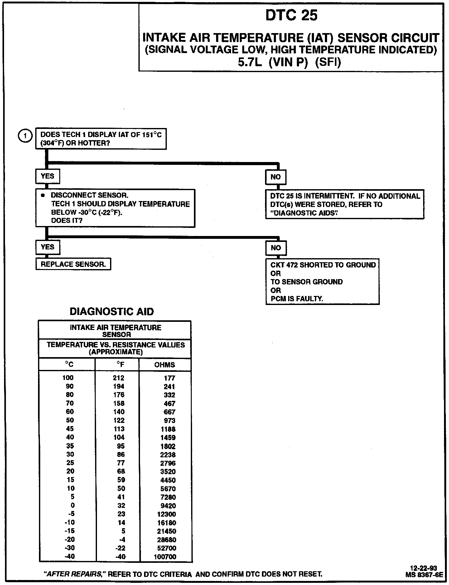 The Intake Air Temperature (IAT) sensor uses a thermistor to control the signal voltage to the Powertrain Control Module (PCM). The PCM applies a voltage (about 5 volts) on CKT 472 to the sensor. When intake air is cold, the sensor (thermistor) resistance is high, therefore, the PCM will sense a high signal voltage. If the intake air is warm, the sensor (thermistor) resistance is low, therefore, the PCM will sense a low signal voltage.