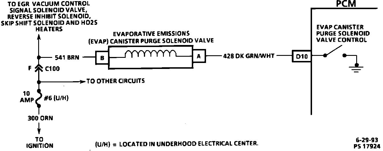 Ignition voltage is supplied directly to the Evaporative Emission (EVAP) canister purge solenoid valve on CKT 541. The Powertrain Control Module (PCM) controls the solenoid valve by providing the ground path through CKT 428.