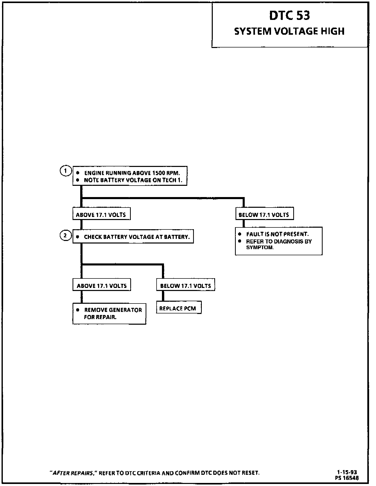 DTC 53 will set when the engine is running and the PCM senses a voltage of more than 17.1 volts on PCM terminal "D3."