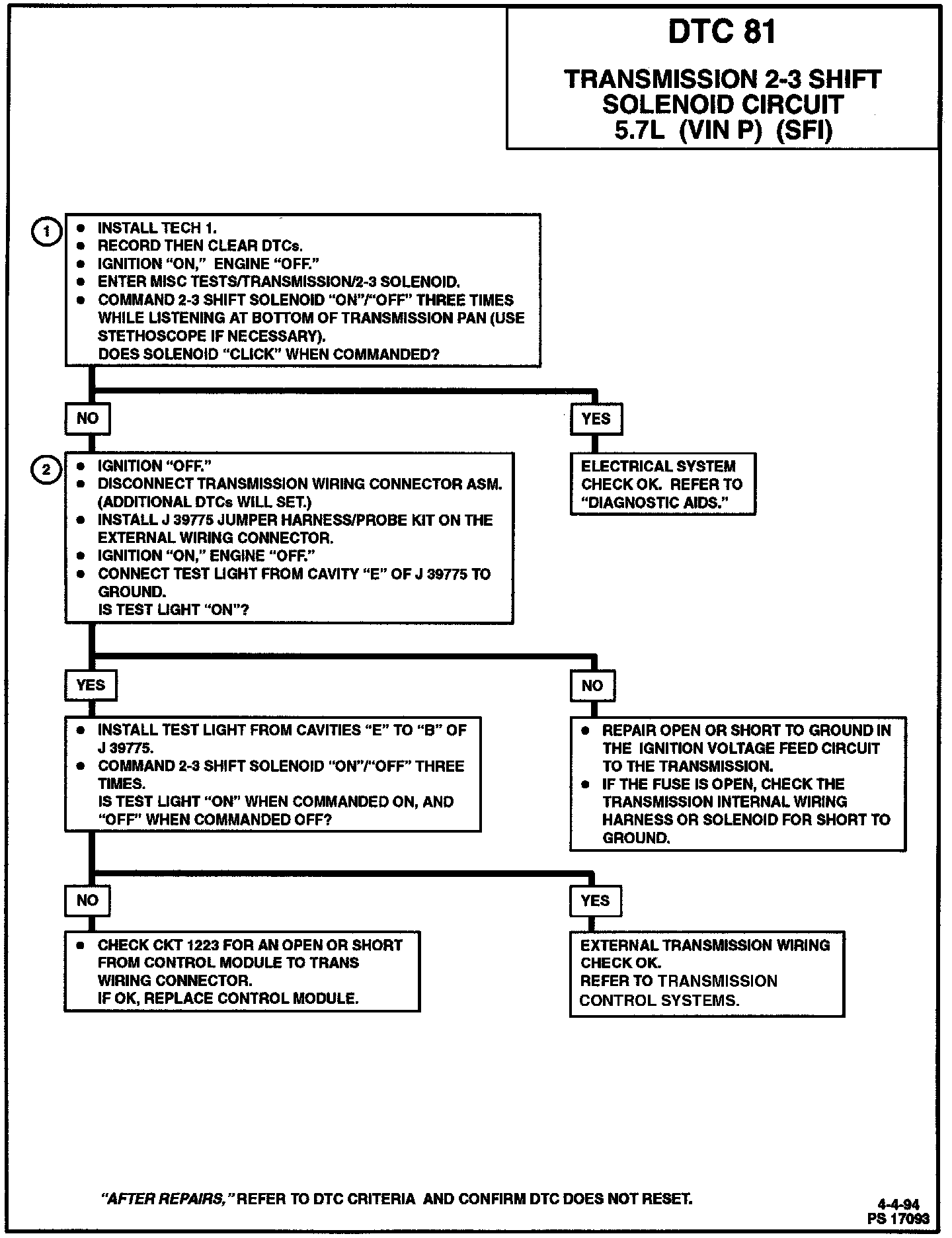 If the solenoid is shorted "OFF" third gear only will occur. If the solenoid is shorted "ON" second gear only will occur. Diagnostic Trouble Code (DTC) 81 will be stored in the PCM memory but will not turn "ON" the Malfunction Indicator Lamp (MIL).