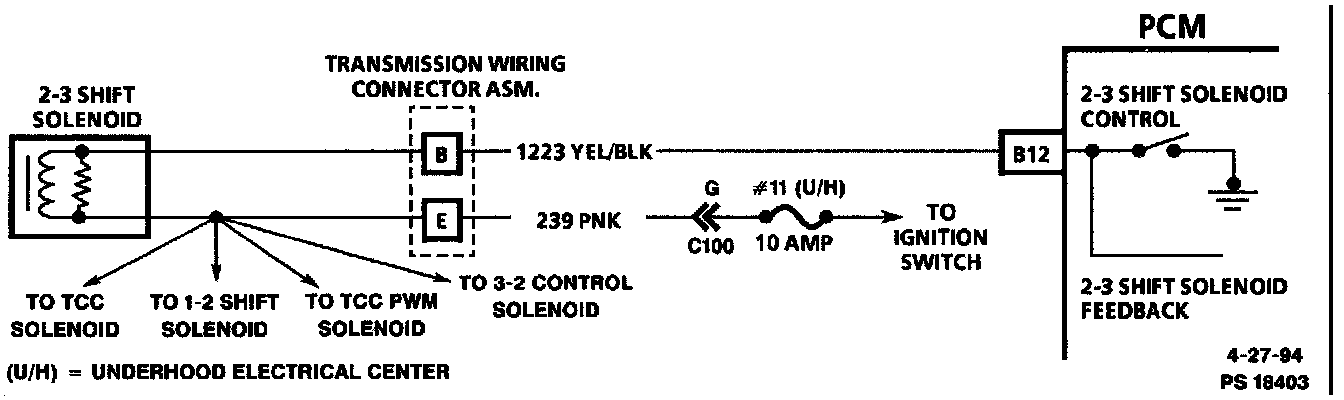 The 2-3 shift solenoid is used to control fluid flow acting on the 2-3 shift valves. The solenoid is a normally open exhaust valve that is used with the 1-2 shift solenoid to allow four different shifting combinations. The solenoid is attached to the control valve body within the transmission. Ignition voltage is supplied directly to the 2-3 shift solenoid. The Powertrain Control Module (PCM) controls the solenoid by providing the ground path through CKT 1223.