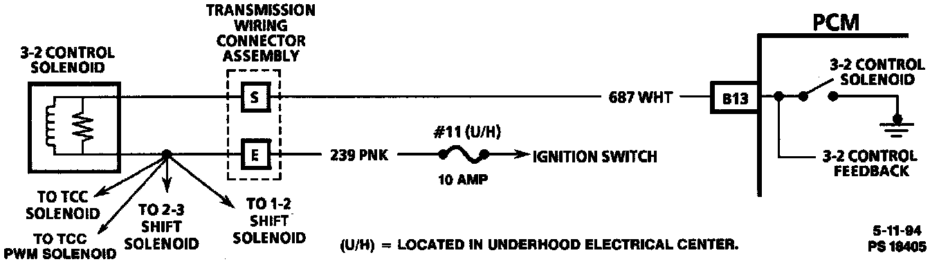 The Powertrain Control Module (PCM) continually monitors the 3-2 circuit duty cycle depending on the commanded state of the circuit terminal "B13." When the transmission is in first gear the duty cycle of the solenoid is equal to O ("OFF"). When the transmission is in second gear or higher the duty cycle of the solenoid will be about 90% ("ON"). When the transmission downshifts, 3-2, the duty cycle of the solenoid will drop.