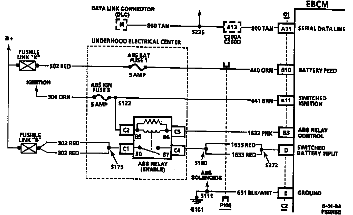 Serial data is transmitted by the EBCM through terminal "A11". The EBCM is supplied switched ignition voltage through terminal "B11", battery voltage through terminal "B10" and switched battery voltage through terminal "D". The EBCM ground is provided through terminal "E".