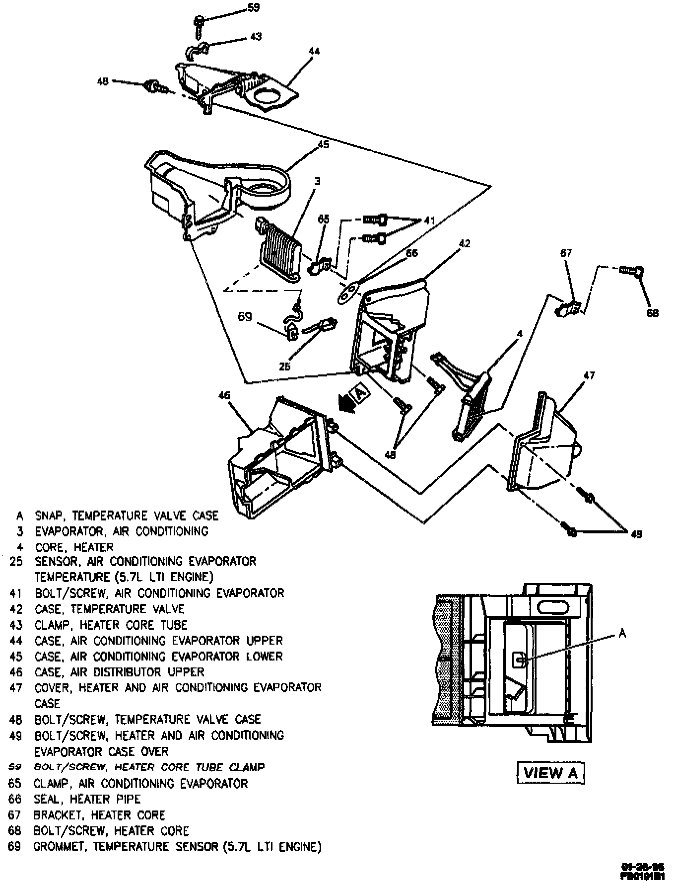 6. Apply sealer GM P/N 3012078 (do not use epoxy glue) between evaporator (3) and evaporator upper and lower case (44 and 45) just behind thermostatic expansion valve to prevent air entry from the engine compartment into the passenger compartment.
