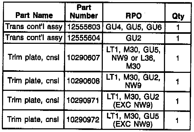 For Pontiac only - The revised trimplates have additional material clearance from the closeout tape to eliminate the interference with the BTSI solenoid. Replace console trim plate assembly per Section 8C of the applicable Service Manual. See parts information located at the end of this bulletin for applicable part numbers.