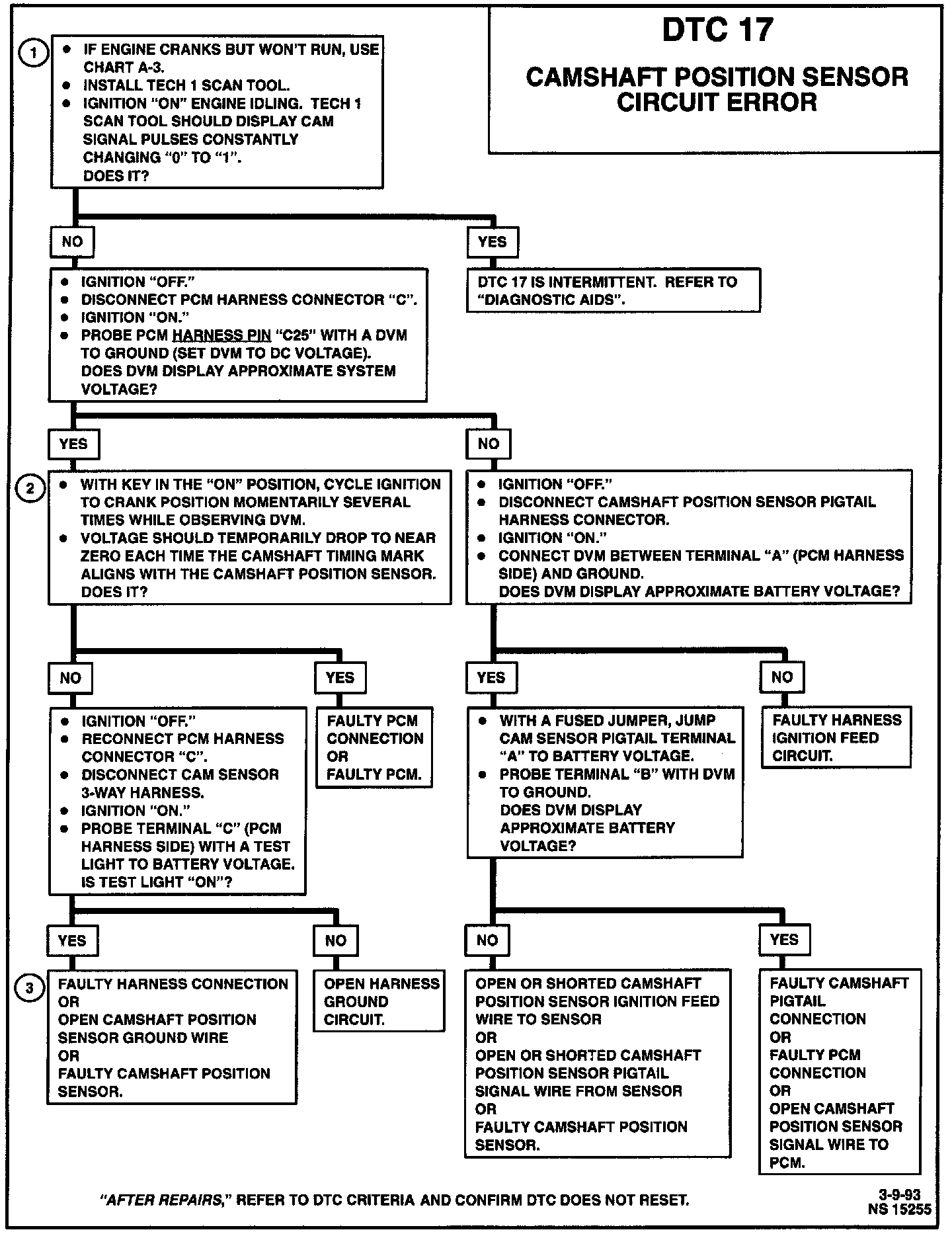 Diagnostic Trouble Code (DTC) 17 Will Set When: Cam reference pulses are not detected by the PCM for 3 seconds while the engine is running.