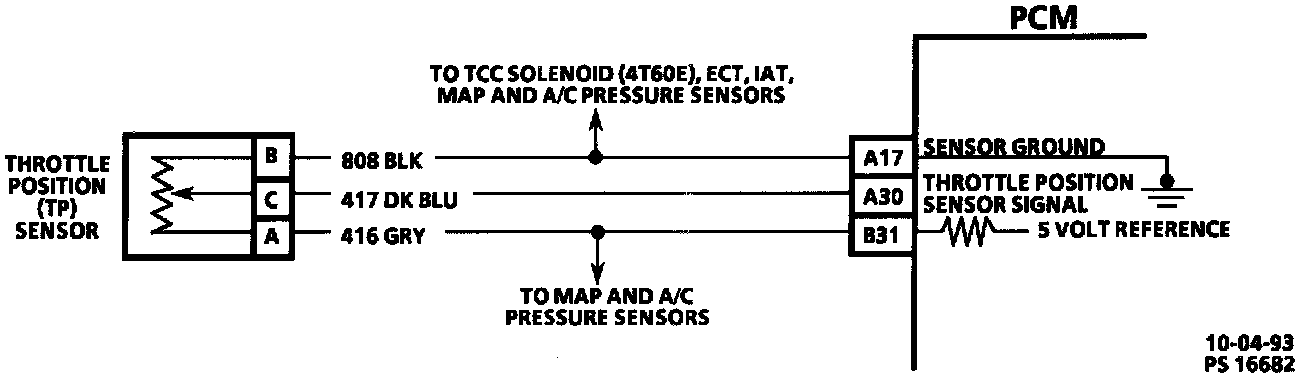 An open in CKT 808 will result in a DTC 21. Scan TP sensor while depressing accelerator pedal with engine stopped and ignition "ON." Display should vary from about 0.5 volt when throttle was closed, to about 4.8 volts when throttle is held at (WOT) position.