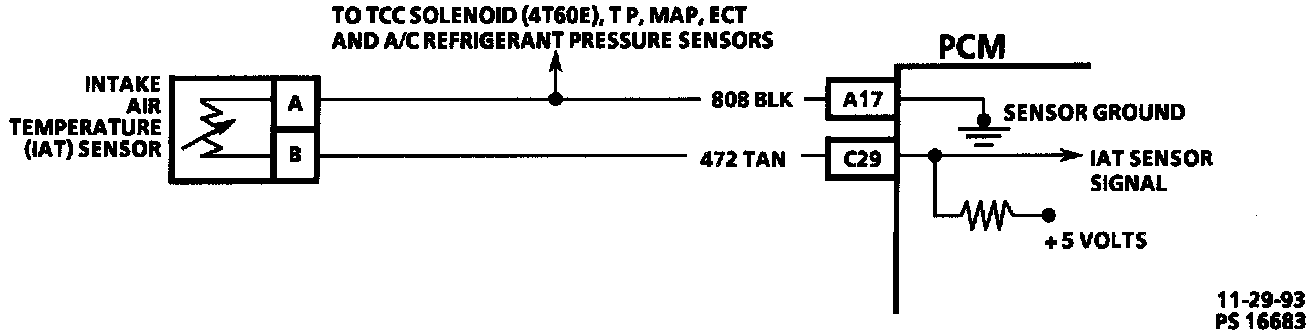 The Intake Air Temperature (IAT) sensor is a thermistor that controls a signal voltage to the Powertrain Control Module (PCM). The PCM applies approximately 5 volts to the sensor on CKT 472. When the intake air is cold, the sensor resistance is high, therefore the voltage sensed at the input "C29" is high. If the air is warm, the sensor resistance will be low, and the voltage input to the PCM will be low.