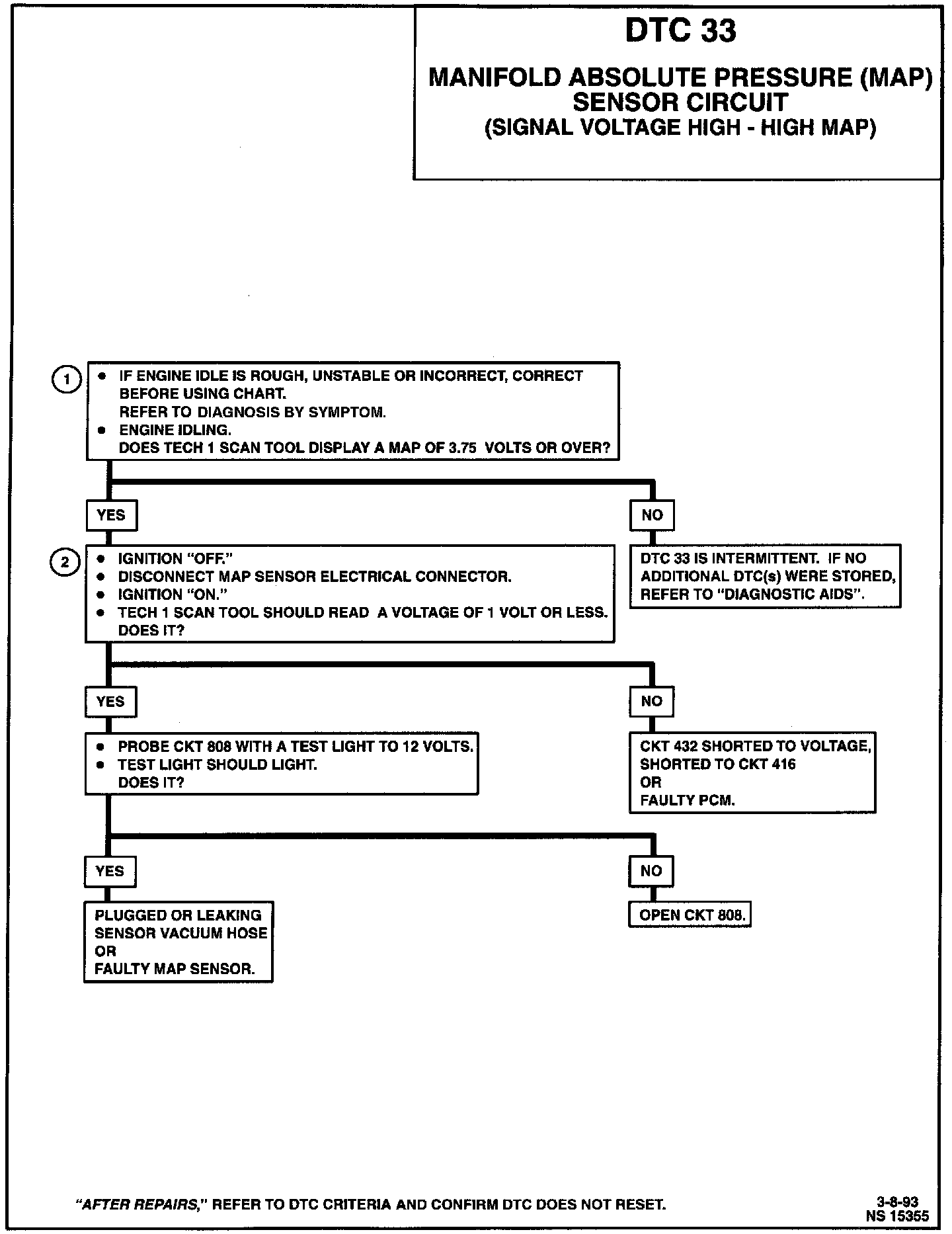 Diagnostic Trouble Code (DTC) 33 Will Set When: No current DTC 21 or 22 is present, MAP is greater than 84 kPa (A/C "OFF") 87 kPa (A/C "ON"), throttle angle is between 3% and 30% and held steady. All conditions met for 4 seconds.