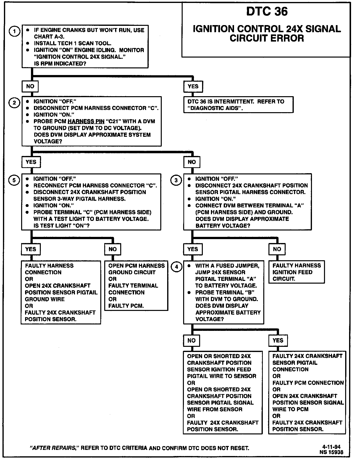 Diagnostic Trouble Code (DTC) 36 Will Set When: The PCM determines that 6 or more consecutive 24X crankshaft position sensor reference pulses have not occurred. This test is executed once per ignition key cycle immediately after start-up.