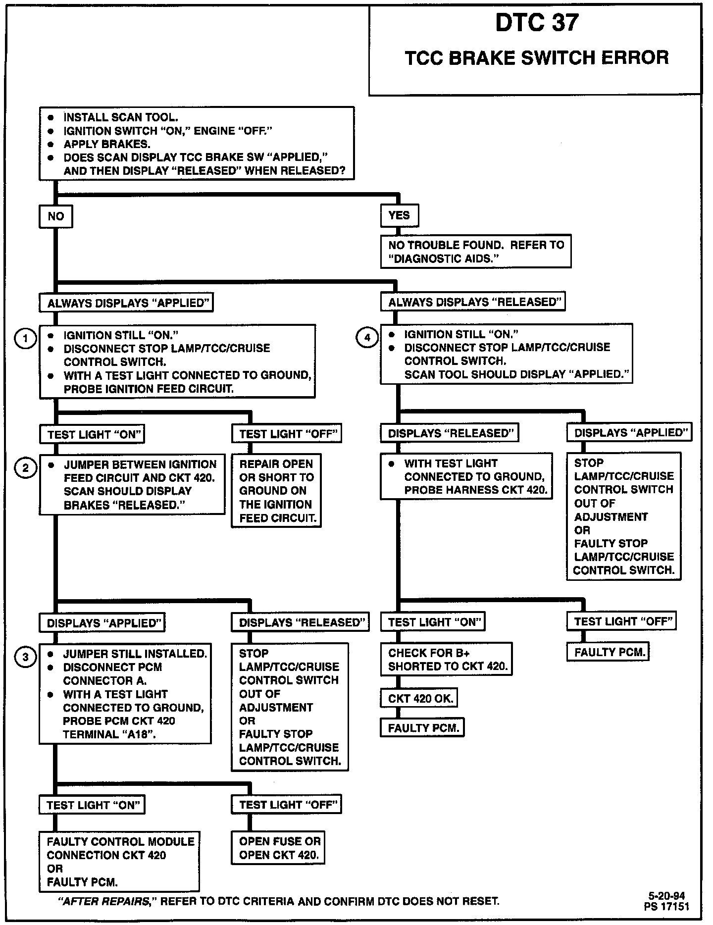 Diagnostic Trouble Code (DTC) 37 Will Set When: Vehicle speed is maintained above 35 mph for 10 seconds and back to 0 mph for 4 consecutive times without the PCM sensing a voltage change on CKT 420 (displayed "RELEASED" to "APPLIED" on Scan tool).
