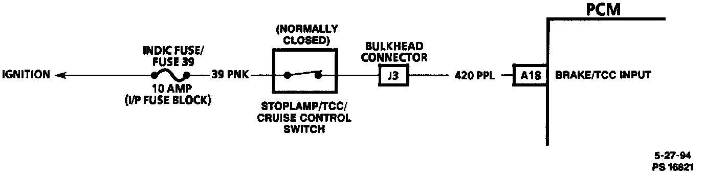 The Powertrain Control Module (PCM) monitors brake pedal activity through PCM terminal "A18". The Stoplamp / Torque Converter Clutch (TCC) / Cruise Control switch is a normally closed switch that opens to interrupt system voltage to the PCM input when the brake pedal is applied.