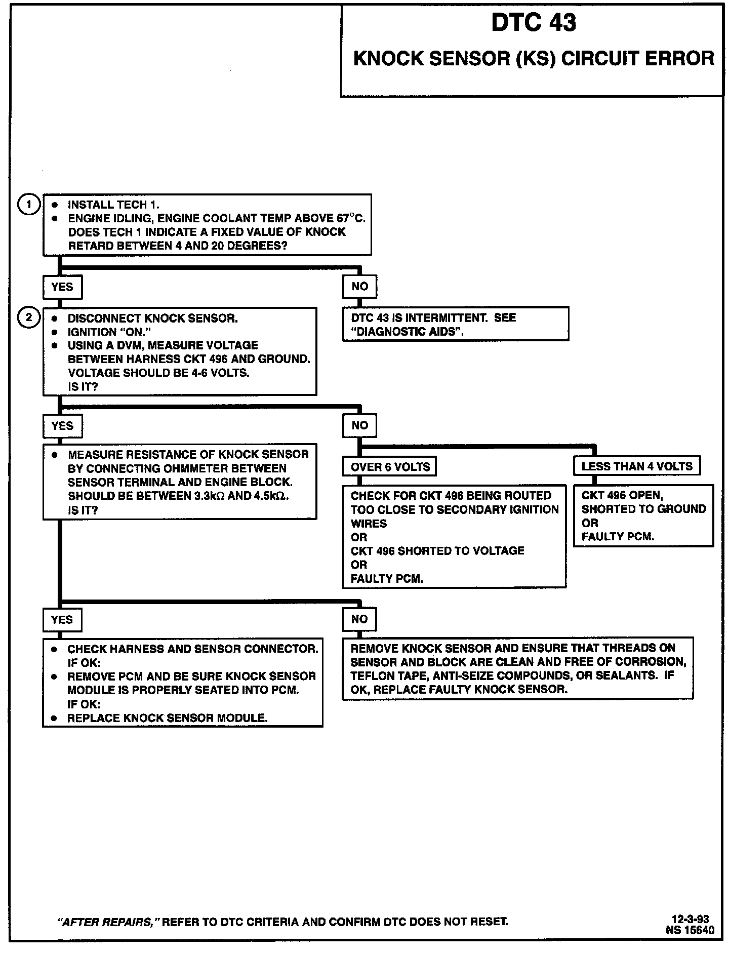 1. If the conditions for DTC 43, as described above, are being met, the Tech 1 scan tool (or equivalent) will always indicate "Yes" when the knock signal position is selected. If an audible knock is heard from the engine, repair the internal engine problem, as normally no knock should be detected at idle.
