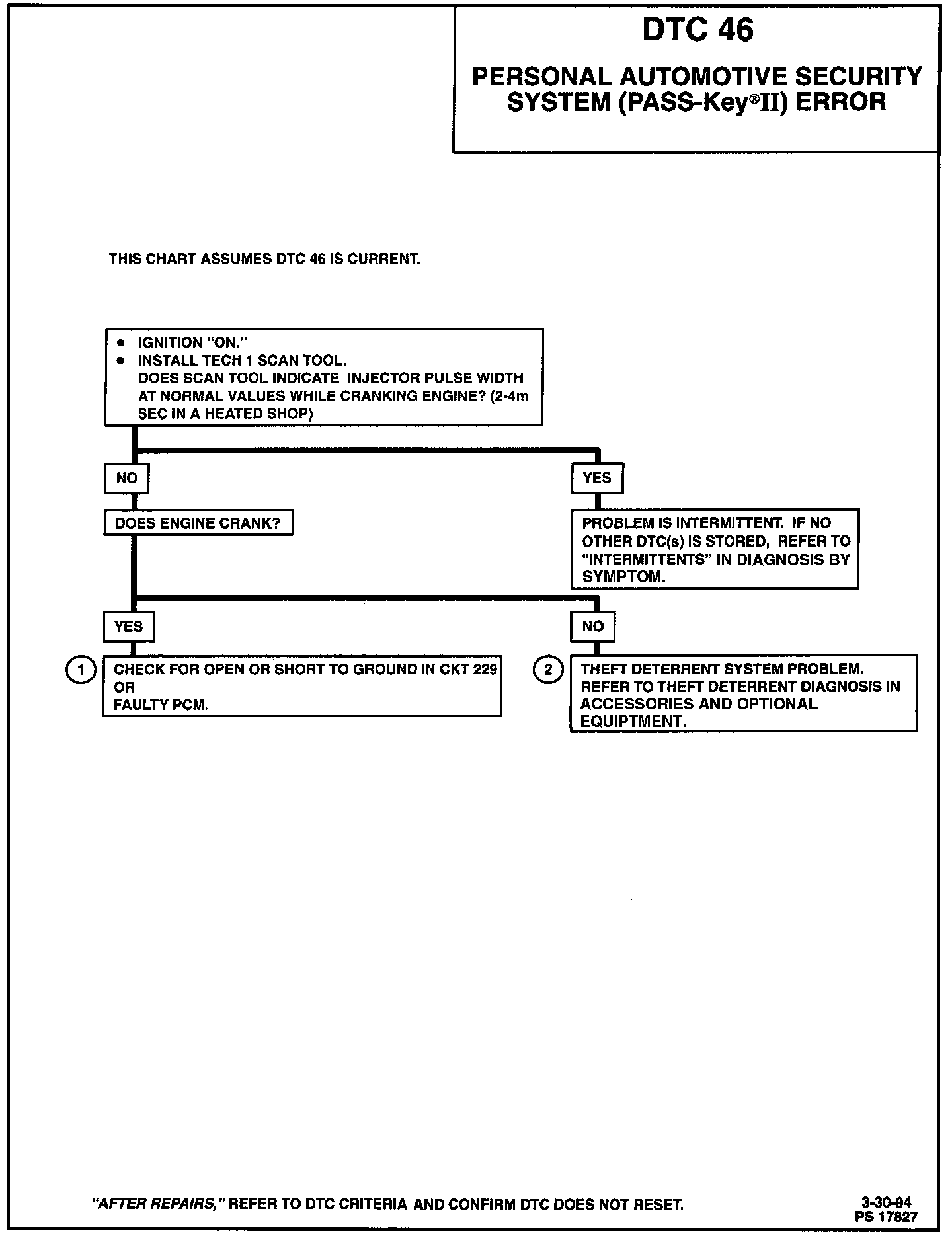 2. If DTC 46 is stored, and the engine will not crank, it indicates that there is a PASS-Key II problem or an incorrect key or starting procedure is being used.