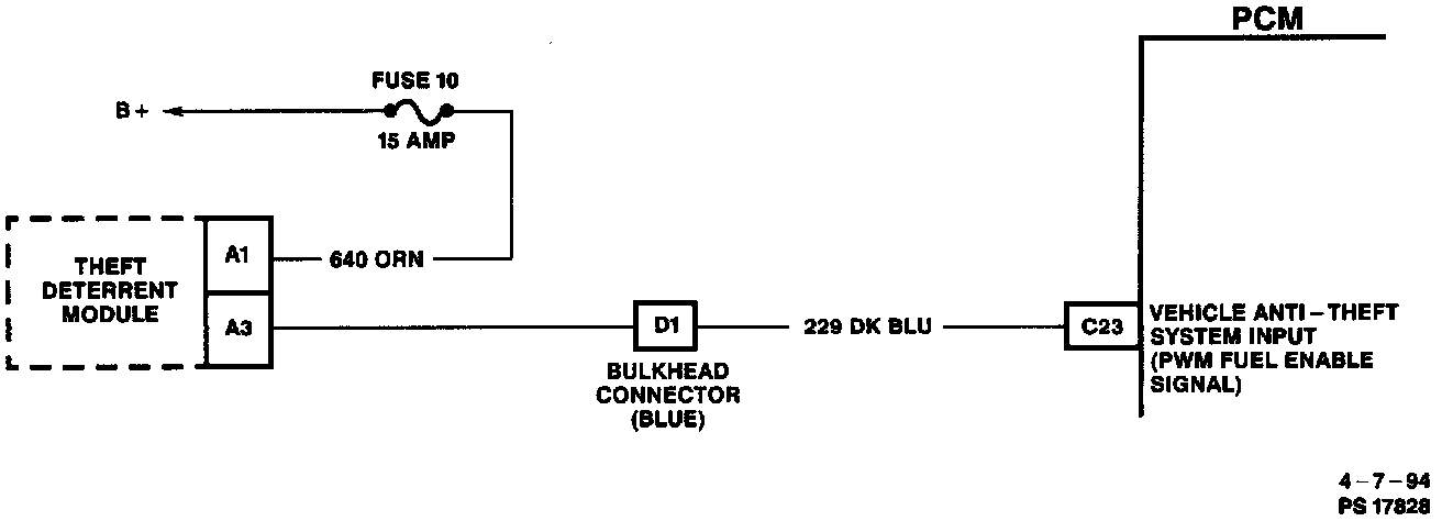 The Theft Deterrent system is designed to disable vehicle operation if the incorrect key or starting procedure is used. The Theft Deterrent module sends a signal to the Powertrain Control Module (PCM) if the correct key is being used. If the proper signal does not reach the PCM on CKT 229, the PCM will not pulse the injectors "ON" and thus not allow the vehicle to be started.