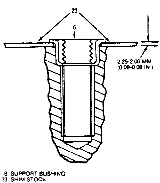 6. Position 0.080-0.090 inch thick shim stock on bracket ear face, then drive support bushings into inner bushings, Fig. 2. When properly installed, bushing should protrude 0.080-0.090 inch above bracket ear face.