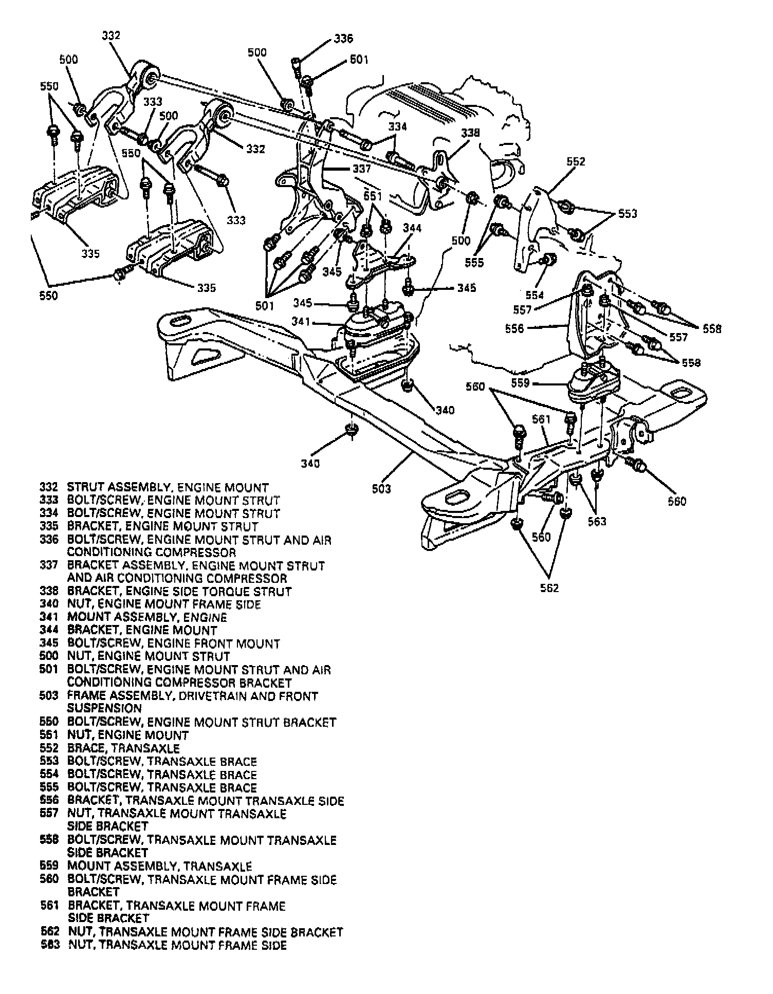 33. Engine mount strut and air conditioning compressor bracket bolts/screws and move compressor assembly aside.