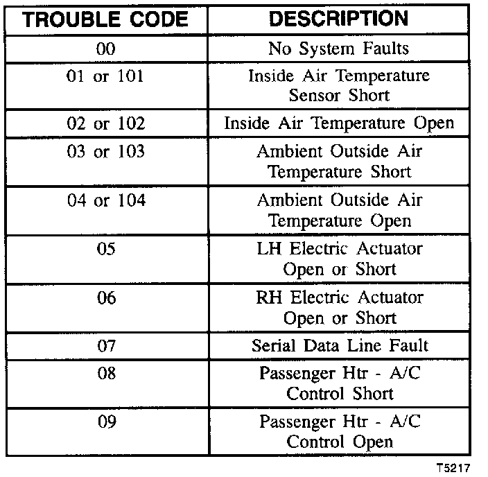 The Diagnostic Trouble Codes reside under Diagnostic Pointer "00." Rotate the "FAN" knob one detent in either direction and the Trouble Code data will be entered. If more than one code exists, they will be displayed at 1 second per fault. Other data used by the computer resides under other Diagnostic Pointers and may not be of use in observing the system. To exit the diagnostic mode, press any mode button.