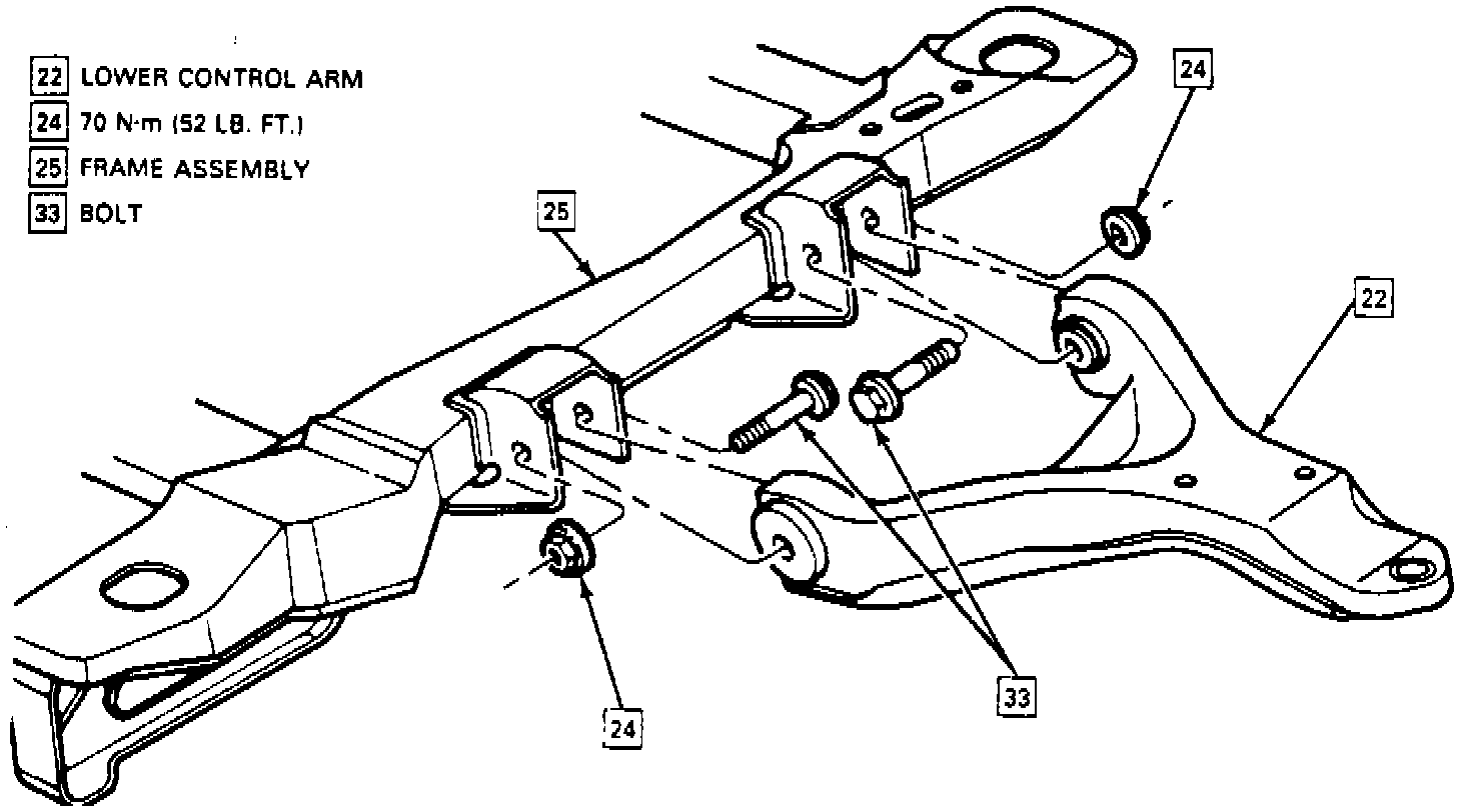 b. Tighten lower control arm to frame bolts to specifications.