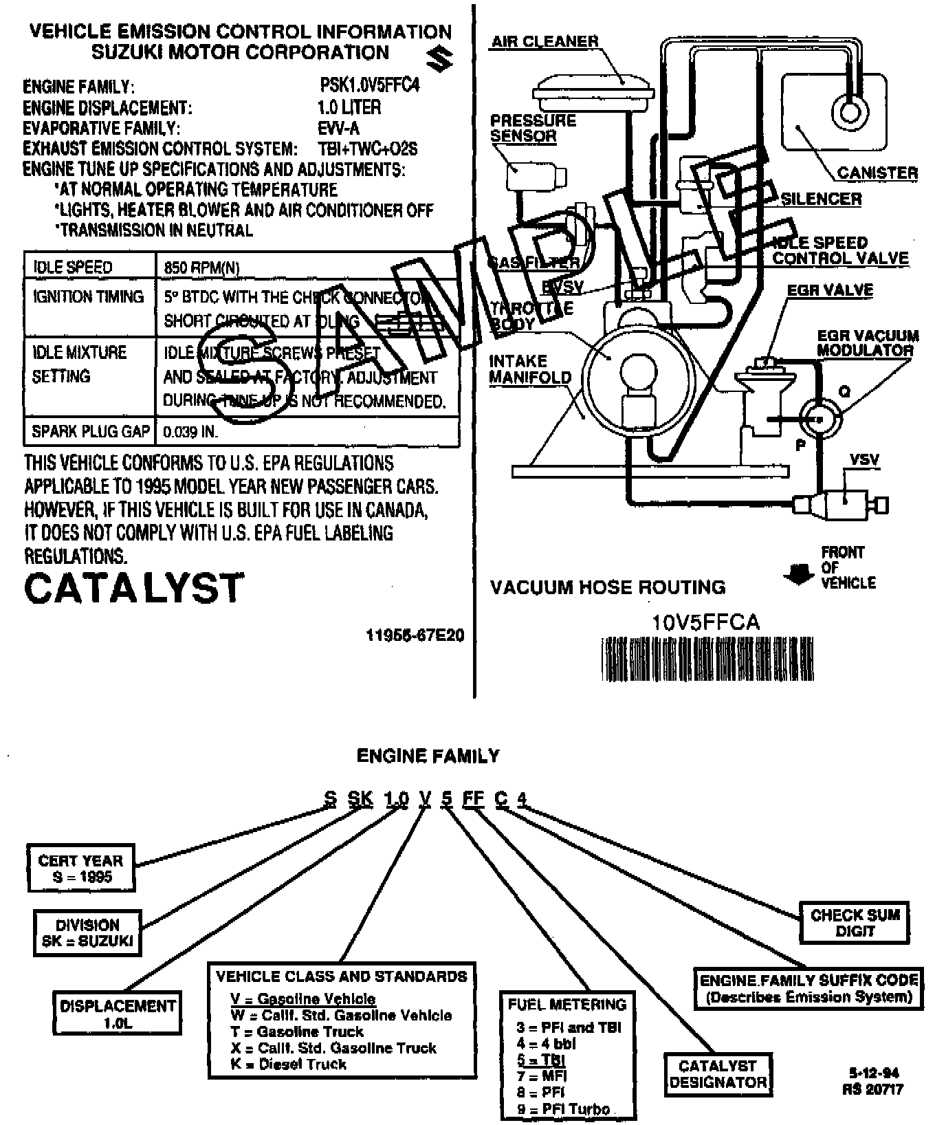 The underhood "Vehicle Emissions Control Information" label, a sample of which is located in the accompanying image, contains important emission specifications and setting procedures. In the upper left corner is exhaust emission information which identifies the year, the manufacturing division of the engine, the displacement of the engine in liters the class of vehicle, and type of fuel metering. The label also contains an illustrated emission components and vacuum hose schematic.