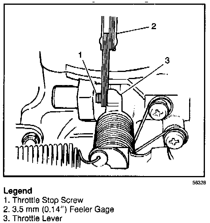 1. Insert a 3.5 mm (0.14-inch) feeler gage between the throttle stop screw and the throttle lever.