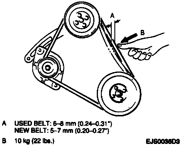 ^ Drive belt to obtain a 6 to 8 mm (0.24 inch to 0.31 inch) deflection with 10 kg (22 lbs.) pressure exerted when reinstalling a used belt.