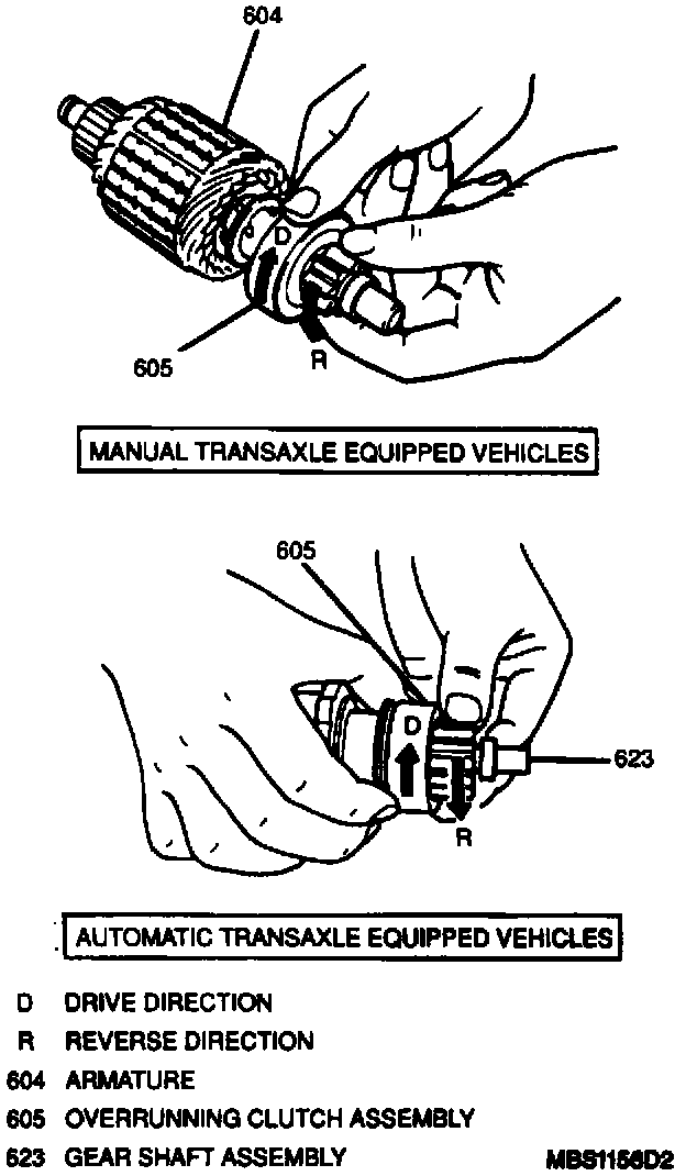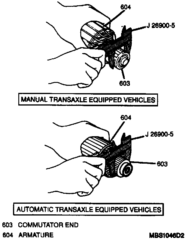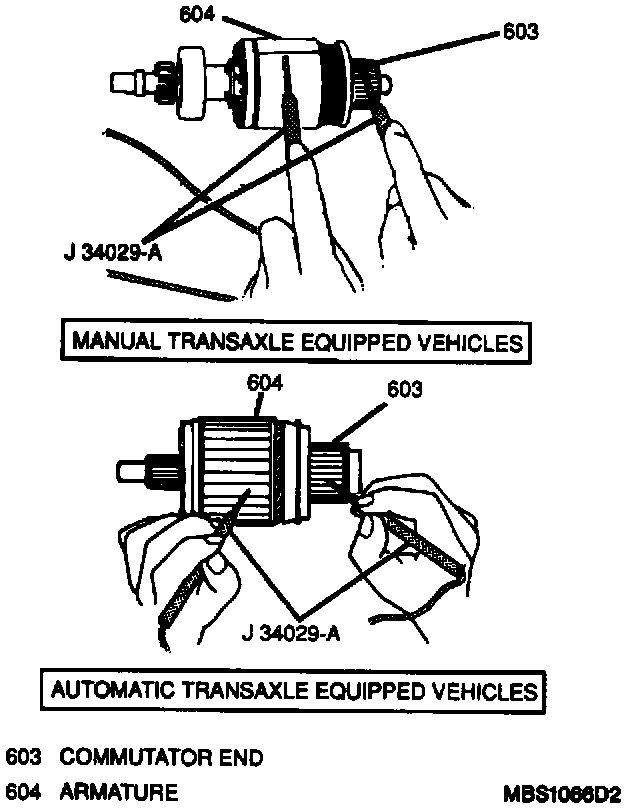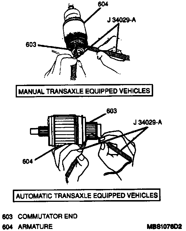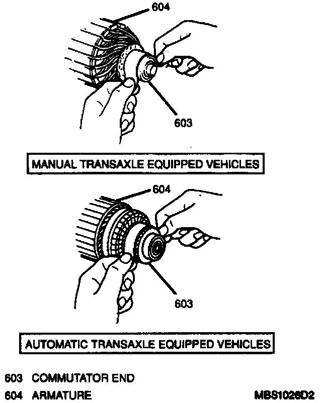 4. Commutator end bushing for wear or damage; replace if necessary (manual transaxle equipped vehicles).