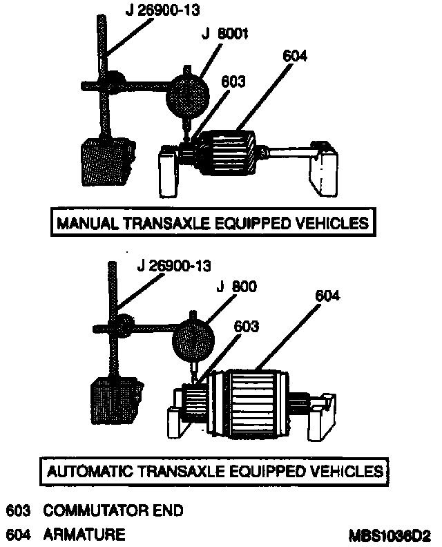 2. Commutator wear using a J 26900-5 to measure the outside diameter of the commutator. Standard commutator outside diameter is 32.0 mm (1.260 inch) (manual transaxle equipped vehicles) or 29.4 mm (1.157 inch) (automatic transaxle equipped vehicles). If the outside diameter is less than 31.4 mm (1.236 inch) (manual transaxle equipped vehicles) or 28.8 mm (1.134 inch) (automatic transaxle equipped vehicles), replace the armature.
