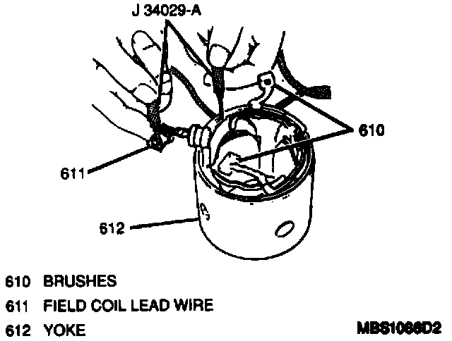 6. Resistance between the field coil lead wire and the yoke using the J 34029-A (manual transaxle equipped vehicles). If resistance is 5 ohms or less, the field windings are grounded and the yoke must be replaced.