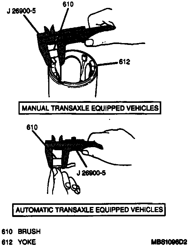 7. Brush length using the J 26900-5. Standard brush length is 17.0 mm (0.67 inch) (manual transaxle equipped vehicles) or 17.5 mm (0.69 inch) (automatic transaxle equipped vehicles). If brush length is less than 11.5 mm (0.45 inch) (manual transaxle equipped vehicles) or 12.0 mm (0.47 inch) (automatic transaxle equipped vehicles), replace the brush.